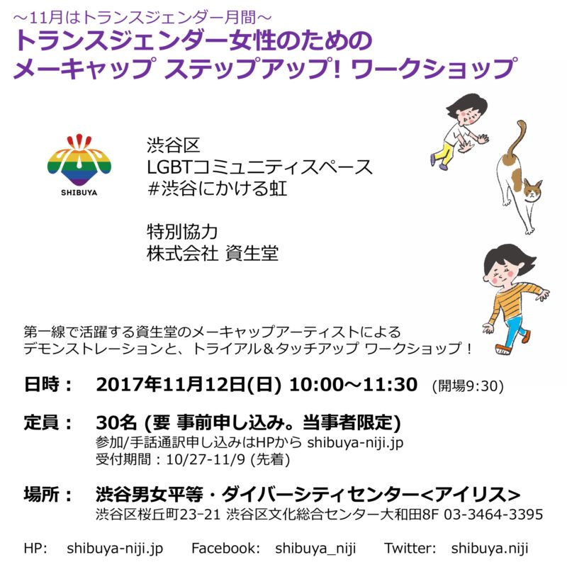 トランスジェンダー月間にちなみ、11月は午前・午後の2回連続開催です! ■午前イベントテーマ: トランスジェンダー女性のためのメーキャップ ステップアップ!ワークショップ *特別協力:資生堂 *要事前申し込み *先着30 […]