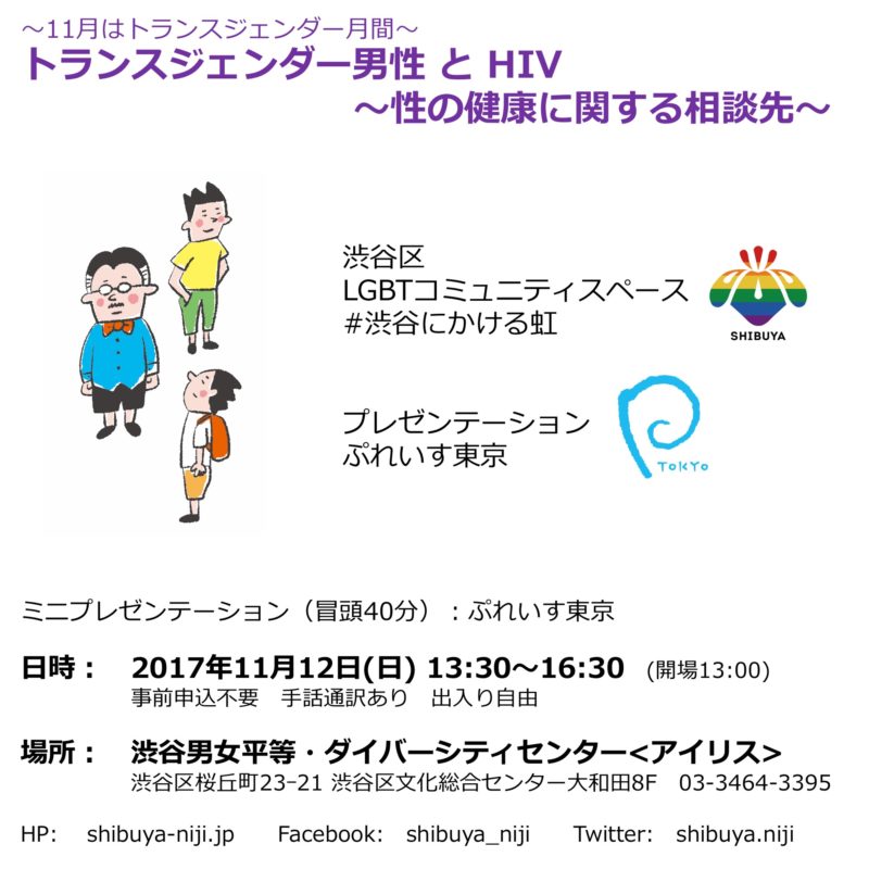 さらに詳しく »トランスジェンダー月間にちなみ、11月は午前・午後の2回連続開催です! ■午後イベントテーマ: トランスジェンダー男性とHIV ~性の健康に関する相談先~ *予約不要 午後イベントでは「ぷれいす東京」さんをお招きしてお話 […]
