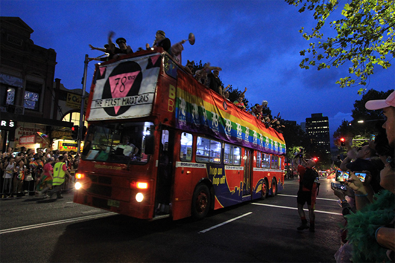 ストーンウォール事件の記念日に合わせて実施された、1978年6月24日(土)午後10時にスタートした同性愛者たちのデモ行進が1回目。当時、シドニーのあるニューサウスウェールズ州ではまだ同性愛が違法であったこともあり、事前にデモの許可を得ていたにもかかわらず、この時のデモの主催者や参加者のうち53人が逮捕されてしまいます。81年からは2月(夏)開催に変更となり、名称も「シドニー・ゲイ・マルディ・グラ」に改められました(88年からは「ゲイ・アンド・レズビアン・マルディ・グラ」に改称)。その後、1984年にニューサウスウェールズ州で同性愛が合法となり、マル・ディグラへの参加者も年々増え続け、今では世界でも指折りのLGBTの祭典になりました。現在は、毎年2月の第2木曜に始まり、3月第1土曜にパレードとアフターパーティーで締めくくられます。シドニーの特徴は、パレードが夜にあるところ。なので、照明や電飾が見もので、さながら某ディズニーランドの「エレクトリカルパレード」のよう。